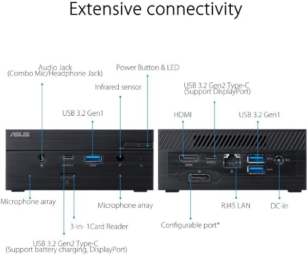 Ports | 1x HDMI, 1 x USB 3.2 Gen2 Type-C(w/ DP output), 1 x Configurable Port (option: VGA/COM/DP/LAN), 2 x USB 3.2 Gen1 Type-A, 1 x RJ45 LAN, 1 x DC-in 1x USB 3.2 Gen2 Type-C(w/ quick charge, DP output), 1 x USB3.2 Gen1 Type-A, 1x 4-in-1 Card Reader, 1 x Consumer Infrared Sensor, 2 x Microphone Array, 1x Audio Jack(optional), 1 x K-Lock(side) |